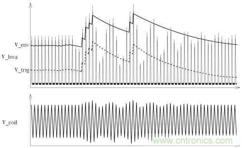 OPA2輸出訊號再傳送到D601、R612、C612為一檢波電路,參考圖6中經過D601訊號為V_env該訊號為波峰訊號之檢波結果,但該訊號之直流穩態非固定值,所以在透過C613、R614、R615構成之去交連耦合電路得到之波形為V_trig,而該波型最後傳到TX-U1進行解碼處理,在圖6中能看到原供電線圈上之訊號V_coil轉換到V_trig之差異。