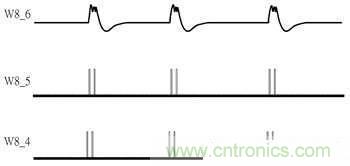 參照圖3錯動式訊號圖,W7_3為受電線圈訊號、W7_1與W7_2分別為P04與P11訊號、W7_4為S1訊號,其與W7_3不同在於通過一個C1電容之諧振效果後取得較強電流推力,其波形也會接近方波訊號;W7_5與W7_6分別為S12與S22訊號,從圖3中可看到設計中的調製訊號從線圈兩端分別進行調製,並分成調製單端、解除調製、調製另一單端後再解除調製完成,此設計的用意在於對受電線圈接收電力影響最小的情況下,產生最大調製訊號。