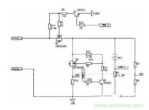 根據三路AD采樣結果確定充電器的充電狀態後,由單片機輸出兩路占空比可調頻率為1kHz的PWM波形PWM1和PWM2分別用來控製兩隻三極管2N5551的導通程度,三極管集電極電流會隨著不同,再經電阻分壓後提供不同的電壓給場效應管的柵極,驅動MOSFET,輸出不停大小的漏極電流Id,給蓄電池提供大小不等的充電電流和放電脈衝幅值,最終達到脈衝充電的效果。