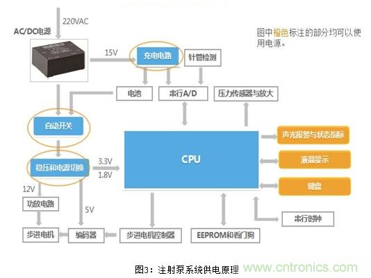 圖3為智能注射泵控製係統供電原理框圖,係統工作情況如下: