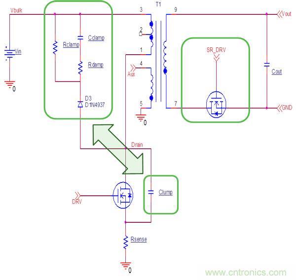 準諧振模式允許使用相對大的緩衝電容Clump,額外增加的Clump (10-22pF)可以減少MOS管關斷損耗,減少電磁幹擾(EMI)。準諧振反激有利於次極端加SR,可降低整流二極管導通損耗,減少次極端整流管尖峰電壓,降低其耐壓要求。