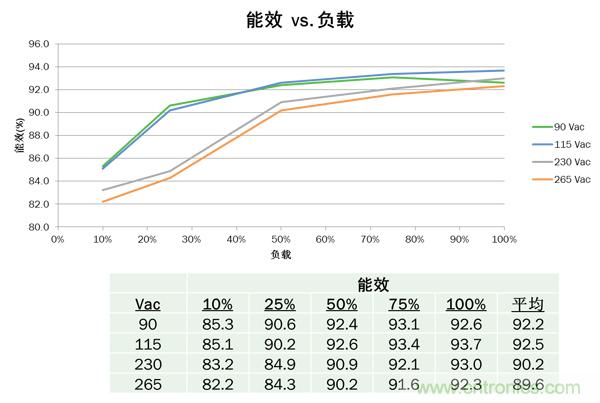 圖4. 45 W參考設計能效 vs. 負載曲線