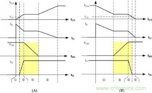 開關導通時對應的波形圖如圖2(A),開關截止時對應的波形圖如圖2(B),可以看到開關管每次導通、截止時開關管VDS電壓和流過開關管的電流ID存在交疊的時間(圖中黃色陰影位置),從而造成損耗P1,那麼在開關頻率fs工作狀態下總損耗PS= P1 *fs,即開關頻率提高時,開關導通與截止的次數越多,損耗也越大。