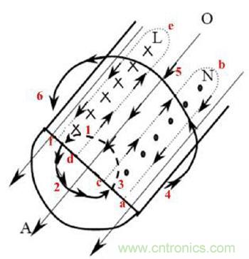 變壓器的鐵損主要由變壓器渦流損耗產生,如圖3所示,給線圈加載高頻電流時,在導體內和導體外產生了變化的磁場垂直於電流方向(圖中1→2→3和4→5→6)。根據電磁感應定律,變化的磁場會在導體內部產生感應電動勢,此電動勢在導體內整個長度方向(L麵和N麵)產生渦流(a→b→c→a和d→e→f→d),則主電流和渦流在導體表麵加強,電流趨於表麵,那麼,導線的有效交流截麵積減少,導致導體交流電阻(渦流損耗係數)增大,損耗加大。