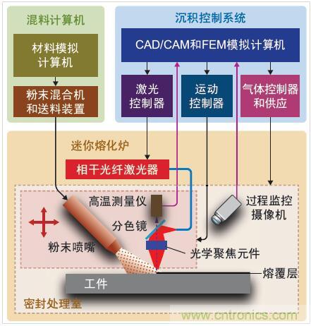 混hun料liao係xi統tong包bao含han幾ji種zhong不bu同tong的de熔rong覆fu粉fen末mo以yi及ji配pei備bei了le材cai料liao模mo擬ni軟ruan件jian的de計ji算suan機ji。迷mi你ni熔rong化hua爐lu包bao括kuo光guang纖xian激ji光guang器qi和he密mi封feng處chu理li室shi,而er後hou者zhe包bao含han光guang學xue聚ju焦jiao元yuan件jian、送粉噴嘴、運動係統、高溫測量儀及過程監控攝像機。沉積控製係統配置了運行著CAD/CAM軟件和有限元方法(FEM)模擬軟件的計算機。
