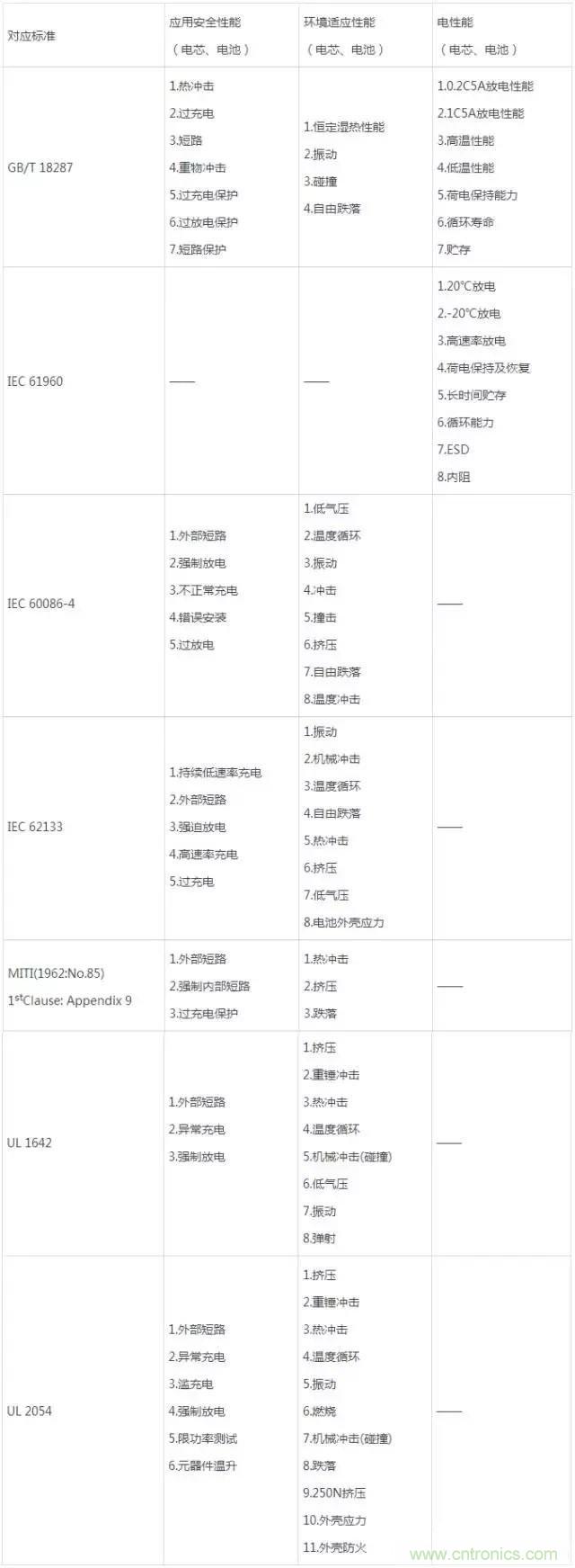 今jin天tian編bian輯ji將jiang這zhe些xie主zhu要yao鋰li電dian池chi標biao準zhun分fen別bie從cong不bu同tong的de角jiao度du考kao察cha了le鋰li電dian池chi的de安an全quan性xing和he電dian性xing能neng,現xian將jiang分fen類lei如ru下xia。從cong表biao上shang可ke以yi看kan出chu,目mu前qian鋰li電dian池chi各ge種zhong標biao準zhun主zhu要yao從cong三san個ge角jiao度du考kao察cha鋰li電dian池chi的de安an全quan及ji電dian性xing能neng: