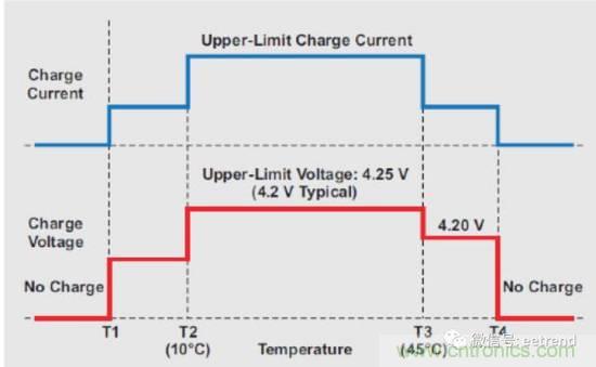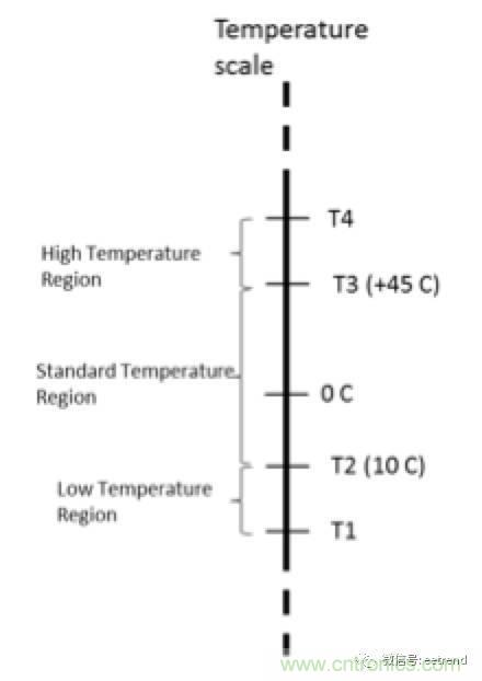 如圖1所示,JEITA規範定義了最低溫度(T1)、最高溫度(T4)和位於二者之間的三個溫度區(低、中、高),以確保充電安全。