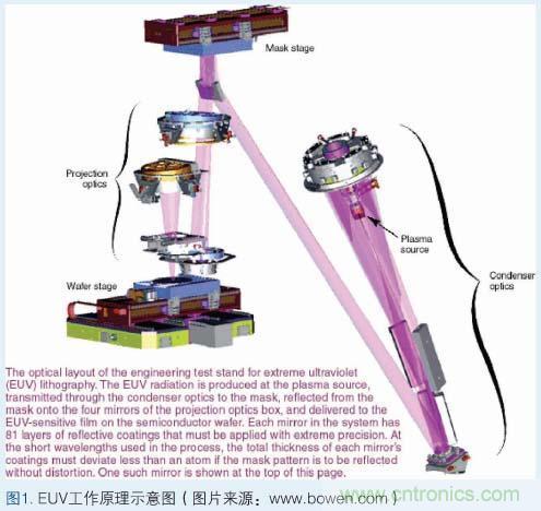 EUV的基本工作原理:激光對準氙氣噴嘴。當激光擊中氙氣時,會使氙氣變熱並產生等離子體;一旦產生等離子體,電子便開始逃逸,從而發出特定波長的光;接著這種光進入聚光器,然後後者將光彙聚並照到掩膜上;通過在反射鏡的一些部分施加而其它部分不施加吸收體,在反射鏡上形成芯片一個平麵的圖案的光學表示,這樣就產生了掩膜;掩膜上的圖案被反射到四到六個曲麵反射鏡上,從而將圖像微縮,並將圖像聚投到矽晶圓上;每個反射鏡使光線稍微彎曲以形成晶圓上的圖像,這就像照相機中的透鏡將光彎曲以在膠片上形成圖像一樣。