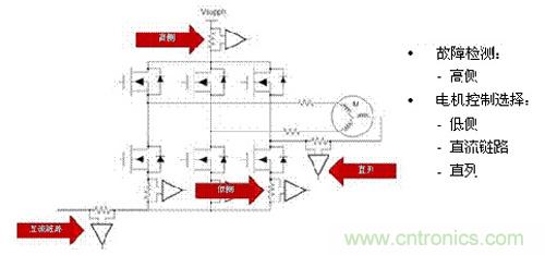 如圖1所示,基本上有三種不同的方法來測量三相電動機驅動係統中的電流:低側、直流鏈路和直列測量。圖1所示的是傳統三相PWM逆變器,該逆變器使用三對功率MOSFET(絕緣柵雙極晶體管IGBT也很常見)來驅動直流電動機。該圖還包括高側電流感應,其通常在顯著錯誤情況下使用,比如接地電路短路的情況。