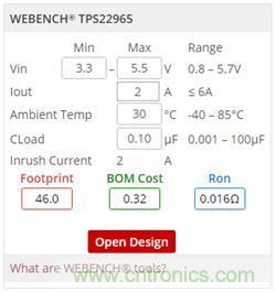負載開關WEBENCH功能可通過產品頁麵右側的WEBENCH組件實現。圖2顯示了TPS22965負載開關的組件。
