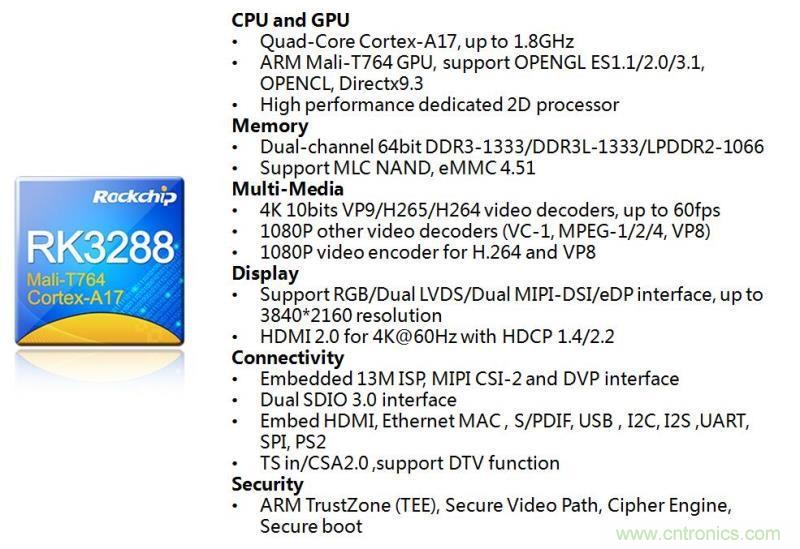 性能方麵,RK3288基於28nm HKMG工藝,處理器采用了四核ARM Cortex-A17,主頻達到了1.8GHz。DDR控製器采用雙通道64bits DDR3/DDR3L/LPDDR2設計。GPU采用四核Mali-T7係列GPU,頻率高達600MHz。該芯片內置了2D/3D圖形GPU加速處理器,完美支持OpenGL ES 1.1/2.0/3.1、OpenCL 1.1、DirectX9.3,在3D效果方麵相較同類產品有較大的提升。RK3288還支持全部主流視頻格式解碼,支持H.265和4Kx2K分辨率視頻解碼。