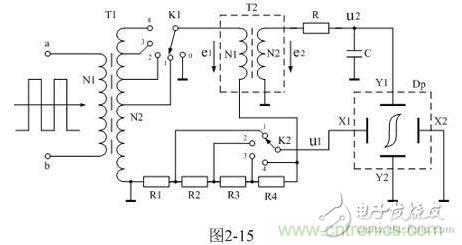在圖2-15中,開關K1是用來選擇輸入電壓幅度的,當K1選擇“1”的位置時,輸入電壓的幅度比較小,被測試樣品的磁滯回線麵積也比較小;當K1選擇“4”的位置時,輸入電壓的幅度比較大,被測試樣品的磁滯回線麵積也比較大。