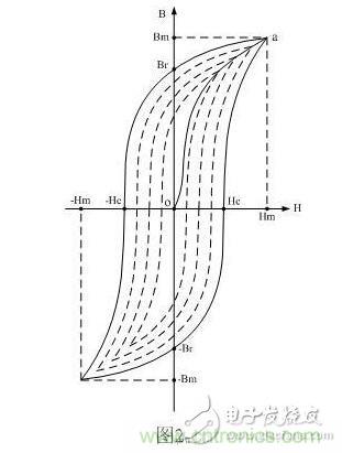 從圖2-16可以看出,當變壓器鐵芯中不存在磁化場時,H和B均為零,即圖2-16中B~H曲線的坐標原點0。隨著磁場強度H的增加,磁通密度B也隨之增加,但兩者之間不是線性關係。當H增加到一定值時,B不再增加(或增加十分緩慢),這說明該變壓器鐵芯的磁化已接近飽和狀態。一般人們都把Hm和Bm分別稱為最大磁場強度和最大磁通密度(對應於圖中a點);而把Hs和Bs分別稱為飽和磁場強度和磁通密度。