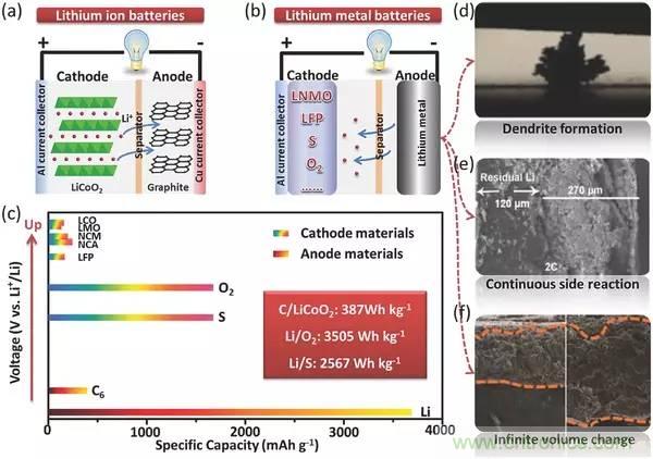 c)典型電極材料在電壓和容量方麵的比較,LMBs的能量密度遠大於LIBs;