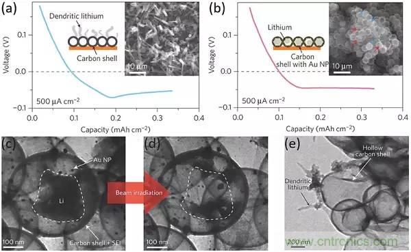 c-e)鋰沉積(c)、原位電子束加熱(d)後具有Au NPs的納米膠囊,鋰沉積後沒有Au NPs的碳殼(e)的TEM圖像。