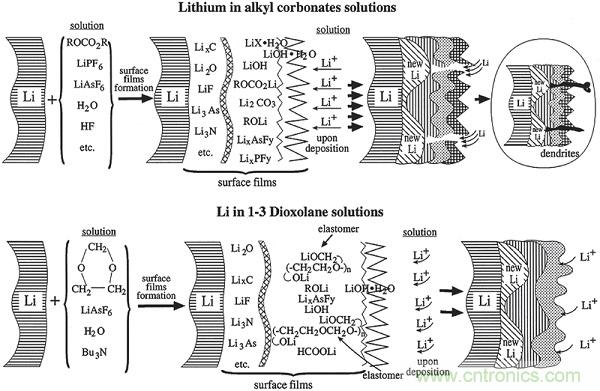 通常,本征SEI層由各種有機物(低聚物和聚合物)和無機物組成,其中有機部分賦予SEI層柔性以適應鋰沉積,而無機部分能夠實現快速的鋰離子傳輸。然而,無機碳酸鋰(Li2CO3)和鋰乙烯碳酸氫鈉(LEDC)作為兩個主要的SEI組分,在鋰沉積電位附近是熱力學不穩定的,並且允許循環中反應發生,而氧化鋰(Li2O)是唯一的熱力學和動力學穩定的組分,最裏麵的SEI層中的Li2O薄層是非常重要的,以避免在沒有氟化物源的情況下破裂。此外,化學和物理各向異性在SEI層ceng內nei是shi常chang見jian的de,同tong時shi導dao致zhi異yi質zhi鋰li通tong量liang和he不bu均jun勻yun沉chen積ji。沉chen積ji和he溶rong解jie時shi,由you無wu機ji離li子zi香xiang料liao組zu成cheng的de表biao麵mian不bu能neng適shi應ying形xing態tai變bian化hua,因yin此ci可ke能neng會hui分fen解jie,導dao致zhi高gao度du不bu均jun勻yun的de鋰li沉chen積ji,使shi得de枝zhi晶jing形xing成cheng。迄qi今jin為wei止zhi,選xuan擇ze合he適shi的de溶rong劑ji、鋰鹽和添加劑可以有效和高效地調節SEI層的性質。