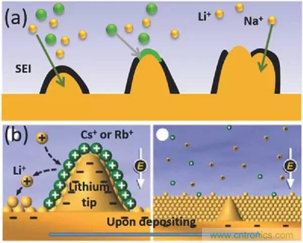 b)自愈式靜電屏蔽機製。Cs+或Rb+將積聚在尖端附近以形成靜電屏蔽,排斥Li+沉積在負極附近區域。
