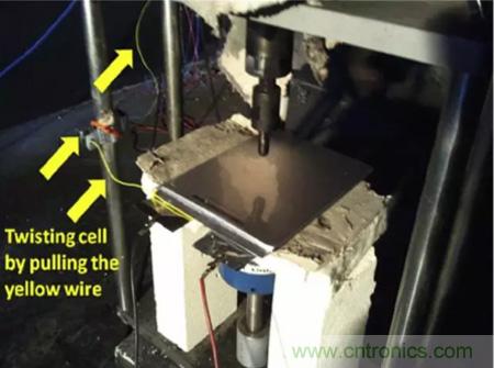 目前能夠模擬鋰離子電池內短路的方式有多種,例如針刺測試,小壓痕測試,BAJ測試和機械擠壓測試等,通過對大尺寸方形電池特點的分析,Hsin Wang認(ren)為(wei)機(ji)械(xie)擠(ji)壓(ya)測(ce)試(shi)最(zui)適(shi)合(he)應(ying)用(yong)方(fang)形(xing)鋰(li)離(li)子(zi)電(dian)池(chi)的(de)測(ce)試(shi)上(shang)。但(dan)是(shi)在(zai)傳(chuan)統(tong)的(de)擠(ji)壓(ya)的(de)測(ce)試(shi)中(zhong)由(you)於(yu)電(dian)池(chi)受(shou)到(dao)的(de)破(po)壞(huai)太(tai)大(da),幾(ji)乎(hu)所(suo)有(you)的(de)電(dian)池(chi)都(dou)會(hui)發(fa)生(sheng)熱(re)失(shi)控(kong),因(yin)此(ci)傳(chuan)統(tong)的(de)擠(ji)壓(ya)測(ce)試(shi)對(dui)不(bu)同(tong)種(zhong)類(lei)電(dian)池(chi)安(an)全(quan)性(xing)的(de)“分辨率”就很低,隻有通過和不通過兩種結果,隻能對鋰離子電池的安全性進行定性分析。可能兩個電池都沒有通過安全性測試,但是A電池的安全性卻要好於B電池,為了能夠準確的評估不同體係電池的安全性能,Hsin Wang對傳統的擠壓實驗進行了改進,通過在電池負極極耳上施加一個拉力,讓電池產生大約5°的扭曲,從而減少在擠壓過程中電池受到的破壞,因此該實驗能夠準確的評估不同種類電池的的安全性高低。