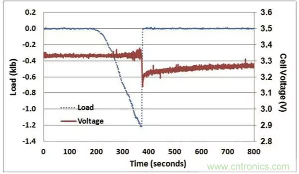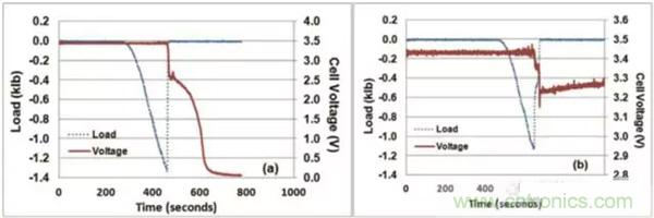 為了方便讀者理解本文,下圖是給出了LFP電池一個非常典型的成功通過機械擠壓測試(正反饋)的判據,電池擠壓變形達到一定的程度後,引起了電池內短路的發生,電池電壓迅速下降,檢測到電壓下降後(0.1V),擠壓力隨之被移除,電池的電壓快速回升,電池沒有發生熱失控,則電池通過擠壓實驗。