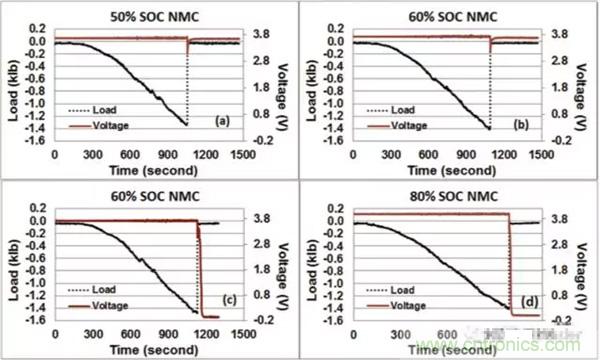 在對25Ah的NMC電池擠壓-扭轉測試中,發現50%SoC狀態下的電池都成功通過了測試,如圖a所示,60%SoC狀態下的電池有三隻通過了測試,如圖b所示,另外的三隻沒有通過測試,如圖c所示,可見60%SoC的電池通過測試和不通過測試的概率各為50%,而80%SoC的電池則都沒有通過測試,如圖d所示。由此可見,60%SoC是NMC電池安全性的一個分水嶺,低於這個數值時電池相對是安全的,高於這個數值,則電池在機械濫用的情況下的安全性將大大下降。