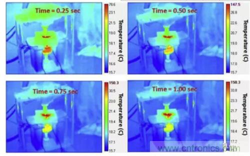 下圖為60%SoC的NMC電池在擠壓-扭轉實驗中的熱成像圖,從圖中可以看到在短路發生後,短路點的溫度在0.5S內迅速升高到了147.5 ℃,隨後高溫區域迅速向周圍擴展,說明周圍區域溫度升高並不是由熱傳導導致的,而是高溫引發了其他的化學反應。而在80%SoC下,NMC電池發生熱失控的溫度更高,引起周圍化學反應的速度也更快。