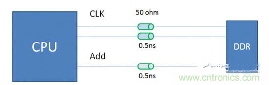 我們來回顧一下,DDR布線,線長匹配的基本原則是:地址,控製/命令信號與時鍾做等長。數據信號與DQS做(zuo)等(deng)長(chang)。為(wei)啥(sha)要(yao)做(zuo)等(deng)長(chang)?大(da)家(jia)會(hui)說(shuo)是(shi)要(yao)讓(rang)同(tong)組(zu)信(xin)號(hao)同(tong)時(shi)到(dao)達(da)接(jie)收(shou)端(duan),好(hao)讓(rang)接(jie)收(shou)芯(xin)片(pian)能(neng)夠(gou)同(tong)時(shi)處(chu)理(li)這(zhe)些(xie)信(xin)號(hao)。那(na)麼(me),時(shi)鍾(zhong)信(xin)號(hao)和(he)地(di)址(zhi)同(tong)時(shi)到(dao)達(da)接(jie)收(shou)端(duan),波(bo)形(xing)的(de)對(dui)應(ying)關(guan)係(xi)是(shi)什(shen)麼(me)樣(yang)的(de)呢(ne)?我(wo)們(men)通(tong)過(guo)仿(fang)真(zhen)來(lai)看(kan)一(yi)下(xia)具(ju)體(ti)波(bo)形(xing)。