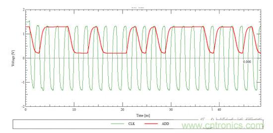 為方便計算,我們假設DDR的時鍾頻率為500MHz,這樣對應的地址信號的速率就應該是500Mbps,這裏大家應該明白,雖然DDR是雙倍速率,但對於地址/控製信號來說,依然是單倍速率的。下麵來看看波形,在地址與時鍾完全等長的情況下,地址與數據端的接收波形如下圖2,紅色代表地址信號,綠色代表時鍾信號。