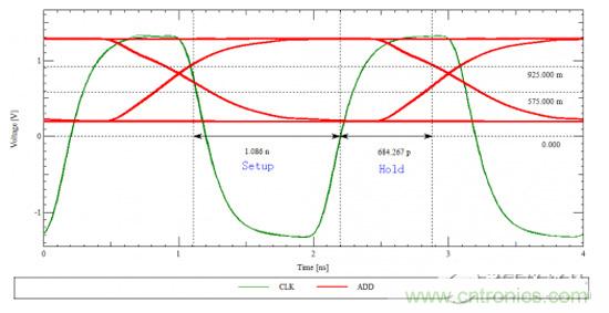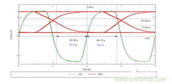 由上圖3.我們可以知道,該地址信號的建立時間大約為891ps,保持時間為881ps。這是在時鍾與地址信號完全等長情況下的波形。如果地址與時鍾不等長,信號又是什麼樣的呢?仿真中,我們讓地址線比時鍾線慢200ps,得到的與眼圖如下:
