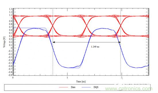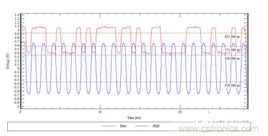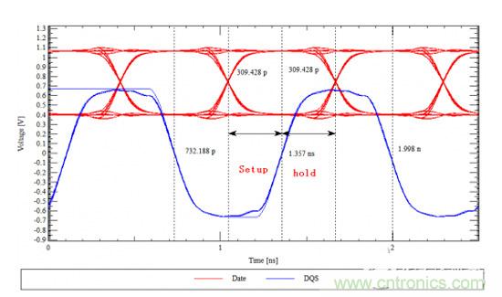 由上圖可知,在地址信號比時鍾信號長的情況下,保持時間為684ps,建立越為1.1ns。可(ke)見(jian),相(xiang)對(dui)於(yu)地(di)址(zhi)線(xian)與(yu)時(shi)鍾(zhong)線(xian)等(deng)長(chang)來(lai)說(shuo),地(di)址(zhi)線(xian)比(bi)時(shi)鍾(zhong)線(xian)長(chang)會(hui)使(shi)地(di)址(zhi)信(xin)號(hao)的(de)建(jian)立(li)時(shi)間(jian)更(geng)短(duan)。同(tong)理(li),如(ru)果(guo)時(shi)鍾(zhong)線(xian)比(bi)地(di)址(zhi)線(xian)長(chang),則(ze)建(jian)立(li)時(shi)間(jian)會(hui)變(bian)長(chang),而(er)保(bao)持(chi)時(shi)間(jian)會(hui)變(bian)短(duan)。那(na)麼(me)雙(shuang)倍(bei)速(su)率(lv)的(de)數(shu)據(ju)信(xin)號(hao)又(you)是(shi)怎(zen)樣(yang)的(de)?下(xia)麵(mian)通(tong)過(guo)具(ju)體(ti)的(de)仿(fang)真(zhen)實(shi)例(li)來(lai)看(kan)一(yi)下(xia)。