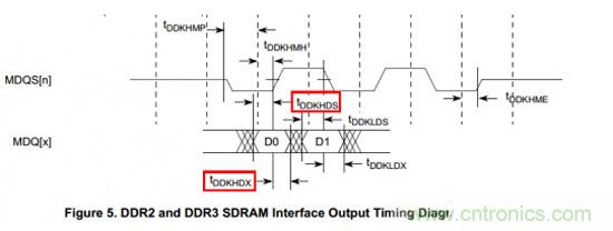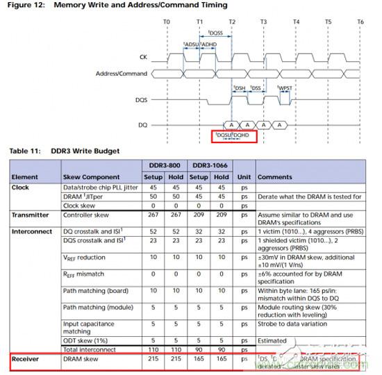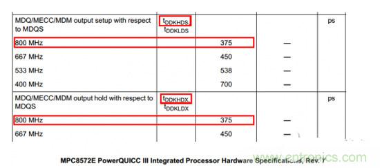 下麵我們通過具體實例來看看時序的計算,下圖是Freescale MPC8572 DDR主控芯片手冊,這張圖片定義了從芯片出來的時候,DQS與DQ之間的相位關係。