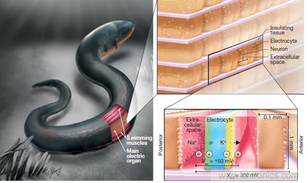 電鰻的所有放電體可以同時翻轉,它們的微小電壓加起來就能產生強大的電能。