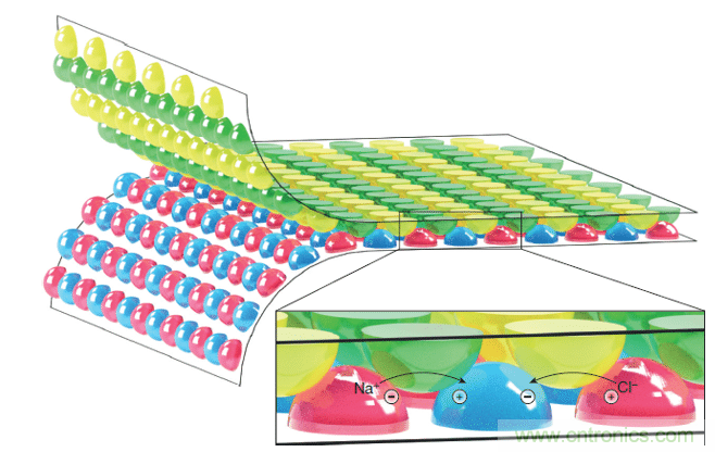紅hong色se凝ning膠jiao含han有you鹽yan水shui,而er藍lan色se凝ning膠jiao含han有you淡dan水shui。離li子zi原yuan本ben會hui從cong紅hong色se凝ning膠jiao流liu向xiang藍lan色se凝ning膠jiao,但dan由you於yu基ji板ban的de間jian隔ge,無wu法fa出chu現xian這zhe樣yang的de流liu動dong。與yu此ci同tong時shi,與yu這zhe塊kuai基ji板ban對dui應ying的de另ling一yi塊kuai基ji板ban上shang布bu置zhi了le綠lv色se和he黃huang色se凝ning膠jiao,當dang它ta們men橋qiao接jie在zai藍lan色se和he紅hong色se凝ning膠jiao之zhi間jian的de空kong隙xi時shi,就jiu能neng為wei離li子zi運yun動dong提ti供gong通tong道dao。