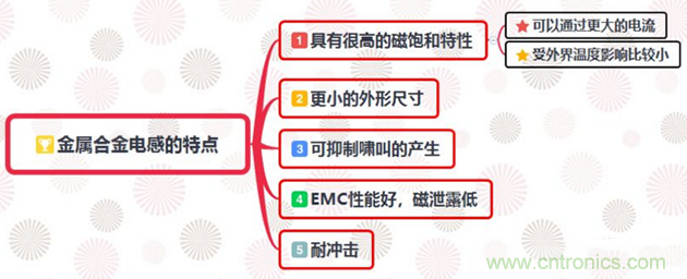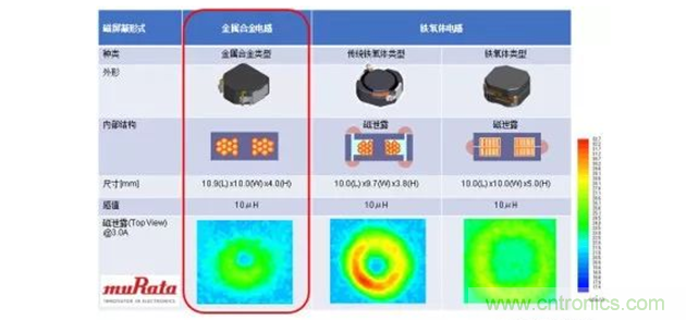 對於金屬合金構造的電感來說,因為形成線圈的磁性材料是微粒的,所以磁場較分散;一體成型構造也能夠控製線材的振動,從而很難產生嘯叫問題。