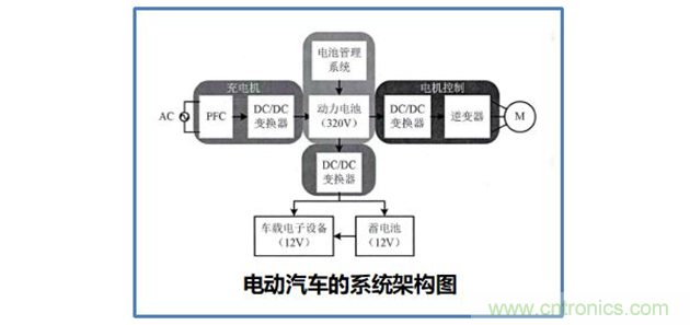 另一方麵,DC/DC變換器可以將電動機製動刹車時由機械能轉化而來的電能回饋給蓄電池組,其效率高達85%~95%,遠(yuan)大(da)於(yu)發(fa)電(dian)機(ji)的(de)正(zheng)常(chang)效(xiao)率(lv)。以(yi)可(ke)控(kong)的(de)方(fang)式(shi)給(gei)蓄(xu)電(dian)池(chi)組(zu)充(chong)電(dian),尤(you)其(qi)是(shi)在(zai)電(dian)動(dong)汽(qi)車(che)需(xu)要(yao)頻(pin)繁(fan)啟(qi)動(dong)和(he)製(zhi)動(dong)的(de)城(cheng)市(shi)工(gong)況(kuang)運(yun)行(xing)條(tiao)件(jian)下(xia),可(ke)以(yi)有(you)效(xiao)地(di)回(hui)收(shou)製(zhi)動(dong)能(neng)量(liang),增(zeng)加(jia)電(dian)動(dong)汽(qi)車(che)的(de)行(xing)駛(shi)裏(li)程(cheng)。因(yin)此(ci),電(dian)動(dong)汽(qi)車(che)采(cai)用(yong)DC/DC變換器可以優化電動機控製、提高電動汽車的整體效率和性能。下圖為電動汽車的係統架構圖。