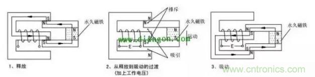 由永久磁鐵保持釋放狀態,加上工作電壓後,電磁感應使銜鐵與永久磁鐵產生吸引和排斥力矩,產生向下的運動,最後達到吸合狀態。