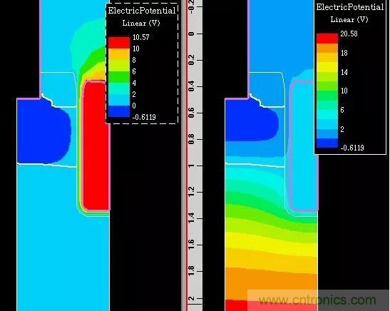 從電勢分布圖,功率MOSFET完全導通時,VDS的壓降低,耗盡層完全消失;功率MOSFET在線性區工作時,VDS的電壓比較高,耗盡層仍然存在,此時由於在EPI耗盡層產生電子-空穴對,空穴也會產生電流,參入電流的導通。