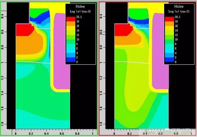 空穴電流產生後,就會通過MOSFET內部的BODY體區流向S極,這也導致有可能觸發寄生三極管,對功率MOSFET產生危害。由空、電流線穴分布圖可見:線性區工作時產生明顯的空穴電流,電流線也擴散到P型BODY區。
