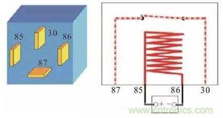 如下圖所示,85#和86#端子是線圈,屬於控製部分;87#和30#端子是觸點,屬於被控製部分(即輸出端)。