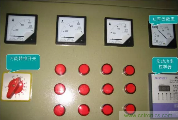 三個電流表A、一個功率因數表COS;功率控製器PK;萬能轉換開關