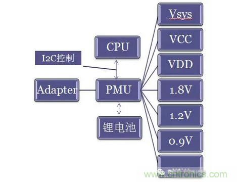 下圖為一般電源管理係統,原始分立電源管理係統,模型一:
