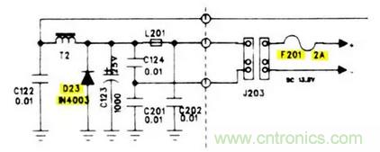 收音機的設計中電源部分有一個二極管,其功能是提供反向保護。基本上,如果你把收音機電源極性接錯了,二極管就會導通(D23),並且熔斷電源線上2安培的保險絲(F201)。這是一個非常典型的電源供電電路。