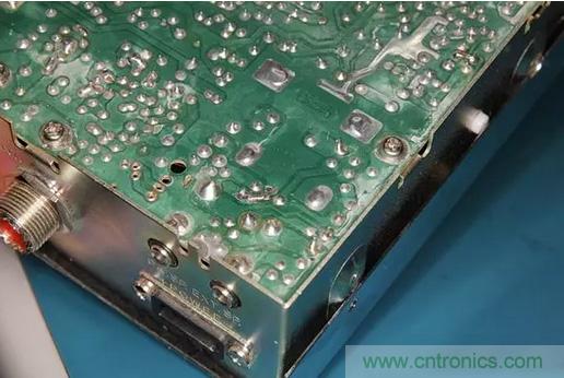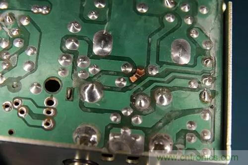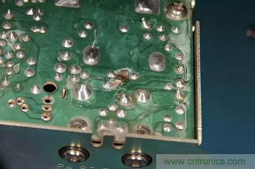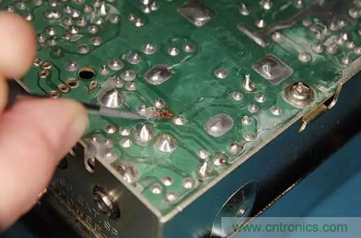 很(hen)自(zi)然(ran)地(di),保(bao)險(xian)絲(si)會(hui)熔(rong)斷(duan),但(dan)大(da)家(jia)又(you)不(bu)總(zong)是(shi)會(hui)用(yong)相(xiang)同(tong)額(e)定(ding)電(dian)流(liu)的(de)保(bao)險(xian)絲(si)來(lai)替(ti)換(huan)。通(tong)常(chang)情(qing)況(kuang)下(xia),他(ta)們(men)會(hui)用(yong)更(geng)高(gao)額(e)定(ding)電(dian)流(liu)的(de)保(bao)險(xian)絲(si)來(lai)做(zuo)替(ti)換(huan)。所(suo)以(yi),當(dang)收(shou)音(yin)機(ji)仍(reng)然(ran)反(fan)向(xiang)連(lian)接(jie)電(dian)源(yuan),就(jiu)會(hui)出(chu)現(xian)保(bao)險(xian)絲(si)沒(mei)有(you)熔(rong)斷(duan),PCB電路板上走線有燒斷的現象。如下圖所示。