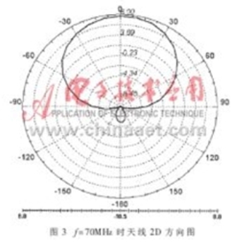 圖3為f=70MHz時天線的二維方向圖,從中可以看出,天線方向性係數達到7dB左右,而利用文獻中的圖表所查到方向性係數為6.5dB。圖4給出了幾個頻率下天線的二維方向圖,可以看出,各個頻率下方向圖形狀大致相同,但隨著頻率越靠近頻率範圍的上下限、方向圖背瓣越大。