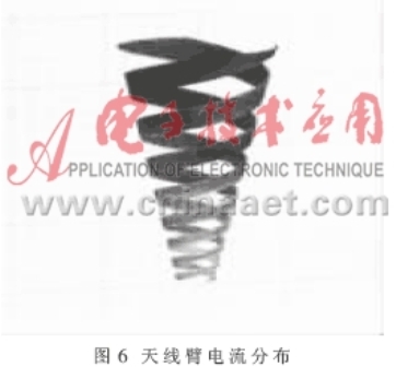 圖6表示頻率f=80MHz時電流在天線臂上的分布,可以看出傳導電流從天線饋電點(即圓錐頂部一端)流入,先經過傳輸區(約下麵的2圈),再向上是輻射區(約第3圈),最後為衰減區(後麵幾圈)。在zai傳chuan輸shu區qu內nei,電dian流liu大da小xiao變bian化hua不bu明ming顯xian,到dao達da輻fu射she區qu後hou,隨sui著zhe大da量liang能neng量liang以yi電dian磁ci波bo的de形xing式shi傳chuan播bo,電dian流liu迅xun速su減jian小xiao,最zui後hou經jing過guo衰shuai減jian區qu,電dian流liu逐zhu漸jian減jian小xiao至zhi零ling,這zhe符fu合he天tian線xian一yi般ban規gui律lv。其qi中zhong,輻fu射she區qu的de位wei置zhi與yu頻pin率lv有you關guan,即ji位wei於yu波bo長chang近jin似si於yu圓yuan錐zhui截jie麵mian周zhou長chang的de地di方fang。可ke以yi想xiang象xiang,不bu同tong頻pin率lv會hui對dui應ying不bu同tong的de輻fu射she區qu位wei置zhi,這zhe是shiCLS天線的工作特性,也是CLS天線具有寬帶特性的原因。