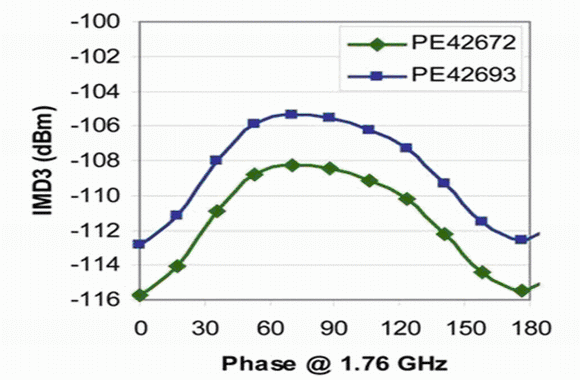 手機中增加的頻段越多,對開關的技術要求就越高,而且WCDMA的線性度和諧波要求對器件性能也帶來了很大的壓力。通過利用UltraCMOS製造工藝的線性優勢,圖2中的單片PE42693 SP6T可以保持其前代SP7T開關+68dBm的IP3,而且IMD3性能超過業界標準的-105dBm(圖1)。