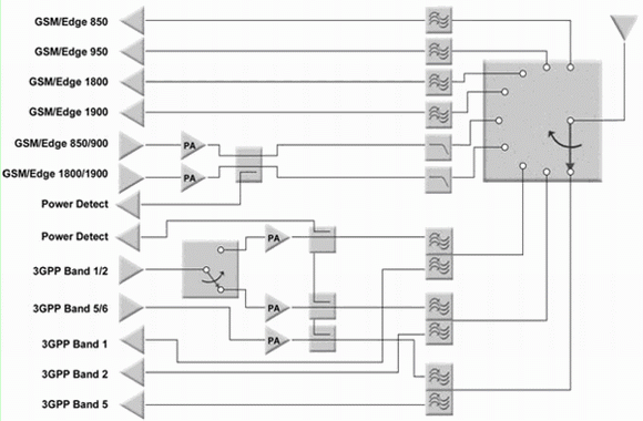 隨sui著zhe多duo頻pin段duan架jia構gou的de普pu及ji,對dui功gong放fang和he相xiang關guan濾lv波bo器qi的de數shu量liang提ti出chu了le嚴yan格ge的de要yao求qiu。事shi實shi上shang,對dui功gong放fang的de技ji術shu要yao求qiu沒mei有you變bian化hua,但dan手shou機ji設she計ji需xu要yao使shi用yong更geng多duo的de功gong放fang。因yin此ci真zhen正zheng改gai變bian的de是shi需xu要yao一yi個ge特te別bie高gao效xiao的de方fang法fa將jiang所suo有you射she頻pin信xin號hao傳chuan送song給gei天tian線xian-單片開關。