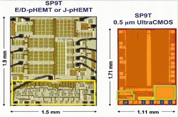 隨著多頻段手機越來越流行,對高集成度、小型天線開關的需求也越來越迫切。UltraCMOS SP7T開關現在已經開始批量生產,SP9T也在2007年底投入批量生產。在外形方麵,GaAs SP7T為1.6x1.5mm,而采用SOS工藝SP7T開關隻有1.2x1.0mm,麵積縮小了一半。目前的GaAs E/D pHemt或J-pHemt SP9T開關外形尺寸為1.9x1.5mm。與之相比,采用UltraCMOS 0.5μm工藝製造的SP9T外形尺寸為1.7x1.1mm(圖3),它不需要片外ESD器件和性能增強匹配器件。UltraCMOS發展規劃預計0.25μm版本的SP9T尺寸將達到1.32x1.29mm。