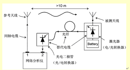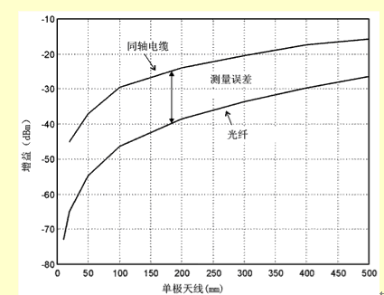 一般地講,我們不知道發射元件的效率和放大器的增益分別是多大(至少不能通過測量得到,但可以通過模擬或者模型分析得到這些數據)。相反,G/T損失是直接通過測量天線的輸出噪聲總功率得到的,這時天線是放在一個特殊的環境中(例如在消聲室中,Ta=T0),增zeng益yi是shi用yong增zeng益yi置zhi換huan法fa借jie助zhu一yi個ge增zeng益yi已yi知zhi的de參can照zhao天tian線xian通tong過guo測ce量liang得de到dao的de。但dan是shi要yao小xiao心xin。要yao通tong過guo標biao定ding把ba測ce量liang設she備bei產chan生sheng的de噪zao聲sheng去qu掉diao,在zai測ce量liang時shi沒mei有you金jin屬shu物wu體ti(同軸電纜線或者電源線)和he它ta相xiang連lian。由you於yu這zhe個ge原yuan因yin,萊lai爾er德de科ke技ji公gong司si研yan製zhi了le一yi種zhong代dai替ti電dian纜lan線xian的de係xi統tong,它ta利li用yong了le光guang纖xian的de原yuan理li,連lian同tong一yi個ge用yong電dian池chi供gong電dian的de前qian置zhi放fang大da器qi,這zhe些xie在zai一yi起qi可ke以yi妥tuo善shan地di測ce定ding小xiao天tian線xian的de電dian氣qi特te性xing(見圖1)。估計同軸電纜線引入的測量誤差的設置如圖2所示。圖2中,在單極天線從基板上伸出來的長度不同的情況下,用同軸電纜線和光纖係統測量了它們的增益。可以看到,在長度為10mm左右(這是內置天線的實際長度)時,測量誤差超過20dB。
