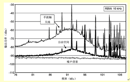 最後,要注意人體對小天線在FM調頻頻帶的增益的影響是正麵的,尤其是使用者的身體與天線或者底板接觸的情況下。這是因為,在100MHz左右,人體是效率相當好的天線,半波長是1.5m左右。圖3給出了人體接觸天線和沒有接觸天線時,接收天線的輸出頻譜。很明顯,用手接觸天線時,G/T提高了10~15dB。由於大多數使用者在聽電話時和移動電話是靠得很近的,所以可以合理地假定,FM調頻天線的實際性能優於它處在自由空間時的性能。