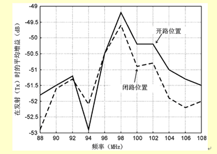 在發射時,發射元件起標準的無源天線作用,它用一個單刀單擲(SPST)通斷控製進行連接(見圖4)。前置放大器處在Rx狀態,仍然與天線連接(但是切斷電源)。用一個內阻為50Ω的信號源供給信號時,失配的半圈天線的增益測定值如圖7所示。寬帶範圍的平均增益(或者效率)達到-53~-49dB。在開關和調頻發射組件之間接入一個匹配網絡,或者選擇適當的功放輸出阻抗,那麼對輸出功率的要求可以放寬很多。